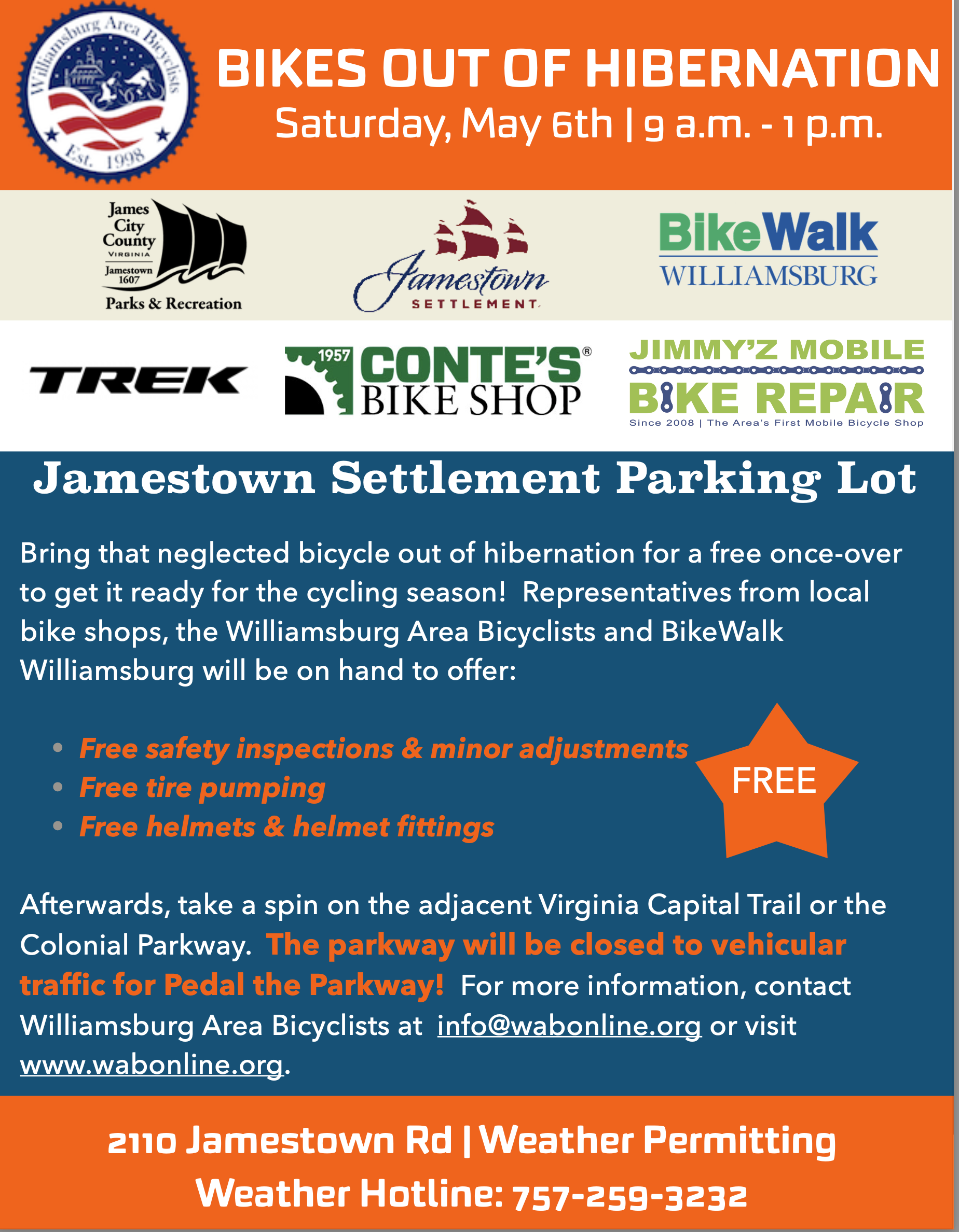 The Williamsburg Area Bicyclists, in partnership with BikeWalk Williamsburg, James City County Parks & Recreation, Jamestown Settlement and several local bicycle shops will once again offer the free “Bikes Out of Hibernation” event on Sat May 6. This event is held in conjunction with the annual PEDAL THE PARKWAY event the first weekend of May. May is National Bike Month. This year Bikes Out of Hibernation will be held from 9 am to 1 pm in the Jamestown Settlement Parking lot. Bring that neglected bike out of hibernation for a free once-over to get it ready for the cycling season! Local bike shops, including Trek, Conte’s, Jimmy Z’s Mobile Bike Repair, the Bicycle Co-Op of Williamsburg, volunteers from the Williamsburg Area Bicyclists and BikeWalkWilliamsburg will be on hand to offer FREE safety inspections, minor adjustments, bike fitting, tire inflation, and FREE helmets and helmet fittings. Refreshments and educational materials will be available. Afterward, take a ride on the Virginia Capital Trail or on the Colonial Parkway car free!