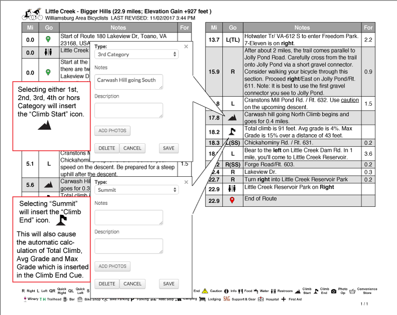 To show the climb start graphic icon, select Type of either "1st Category", "2nd Category", "3rd Category", "4th Category" or "Hors Category". It doesn't matter which category climb you select, they are all treated equally to mark the beginning of a climb. To show the climb end icon, select "Summit" in the Type field. NOTE: This cue sheet generator will AUTOMATICALLY calculate the total climb, average grade %, max grade % and ground distance traveled at that max grade. This information will be inserted in the cue sheet "Notes" column on the entry corresponding to the climb end (summit).