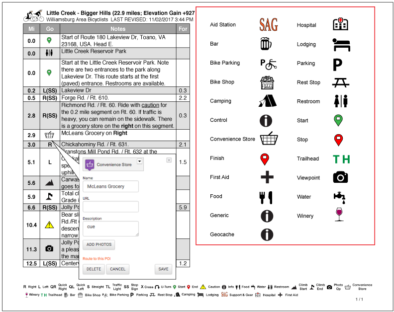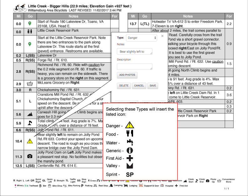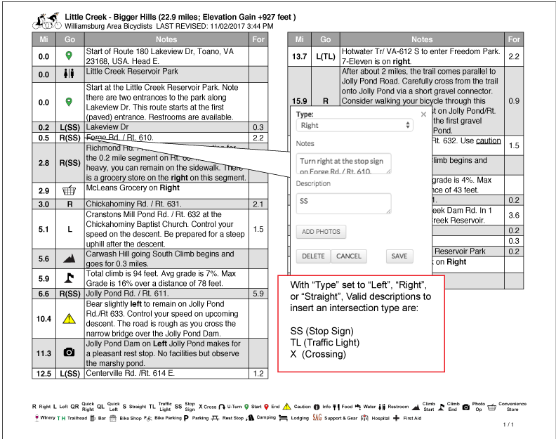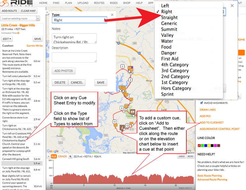 There is extensive help on the Ride With GPS website and you are encouraged to refer to that for "how to" information for creating a route. However, below are a few tips that will allow you to take full advantage of the features built into this custom Cue Sheet Generator.