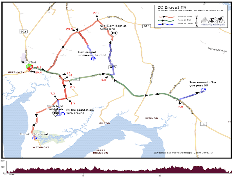 The route on the map is normally designated in Red. But you can further designate sections on the route that are on a trail or on a non-paved (gravel) roadway. Trails will be shown in Green and non-Paved/Gravel segments in Blue. See below example: